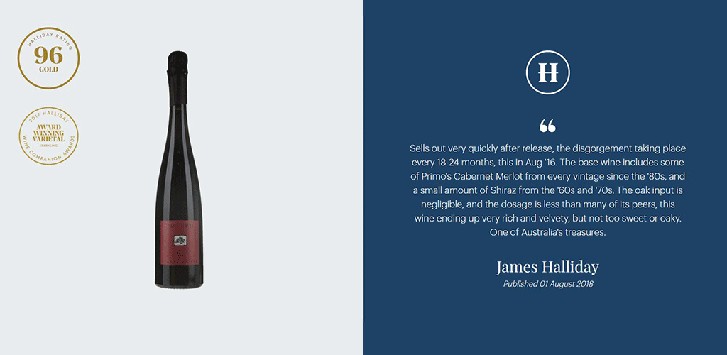 JOSEPH Sparkling Red NV - "Uniting every vintage since the eighties and a selection of the sixties and seventies, this is a sparkling red that contrasts the deep tertiary, savoury complexity of grand old age with the dark berry fruits, black olives, bay, liquorice, sarsaparilla, cherry liqueur and dark chocolate that characterise McLaren Vale. Fine tannins and balanced dosage of old fortifieds complete a finish as expansive and complex as its inimitable recipe! 95 points." – Tyson Stelzer, October 2024