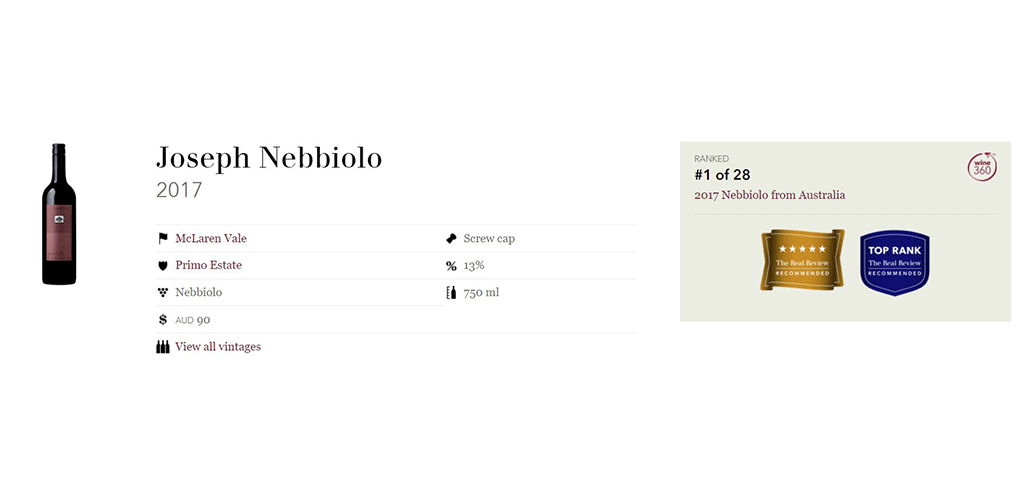 "Expressive dark cherry fruit with lifting eucalyptus and herbaceous aromas. Well-balanced and complex fruit with well-integrated oak. Soft and supple on the finish". 93 points - #1 rated Australian Nebbiolo, tied second place overall.
