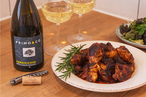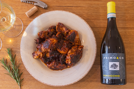 A rustic chicken braise from Le Marche - tomato, garlic, and rosemary infuse the chicken with deep flavour and a light glaze. Perfection with the full texture and vibrant peach notes of our Verdicchio Classico Superiore.